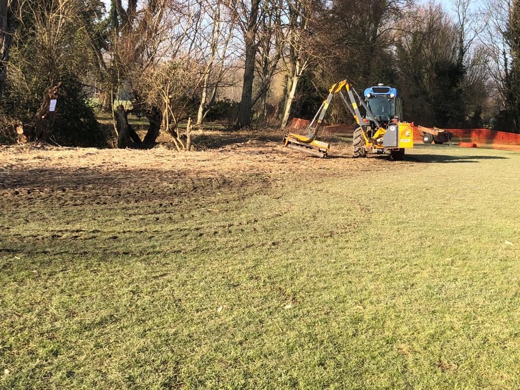 Neglected outfall for surface water from village housing recovered from overgrown brambles and vegetation with excavator mulcher before reprofiling drain