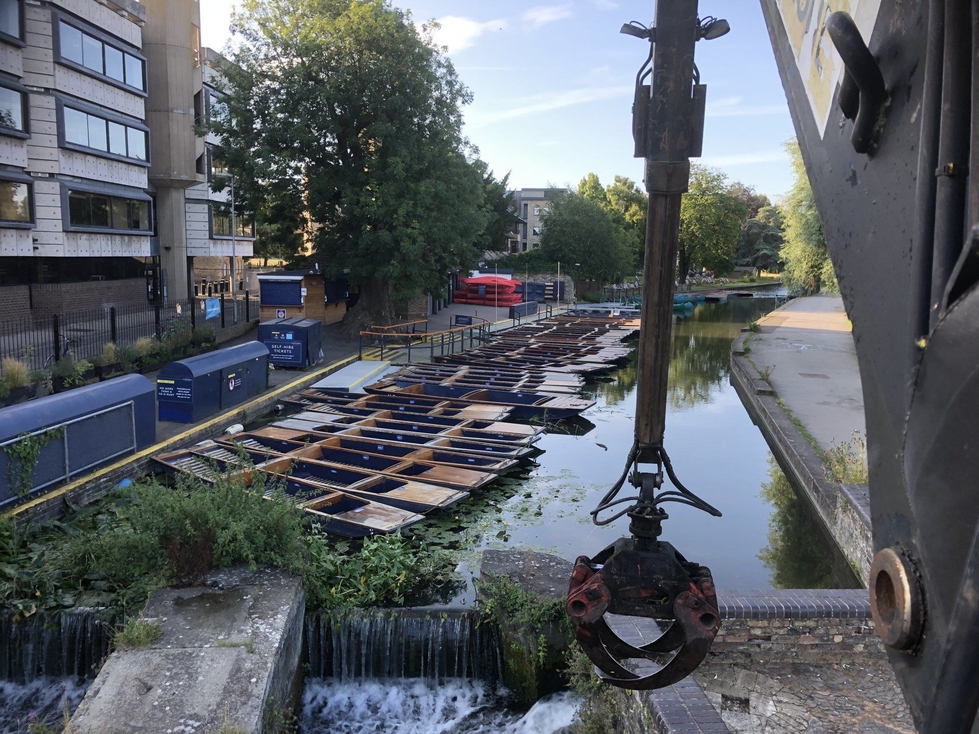 Timber washed down river by flood water removed from the sluice before it could get tangled up with punts in the Mill Pond on the river Cam, using Unimog mounted timber crane.