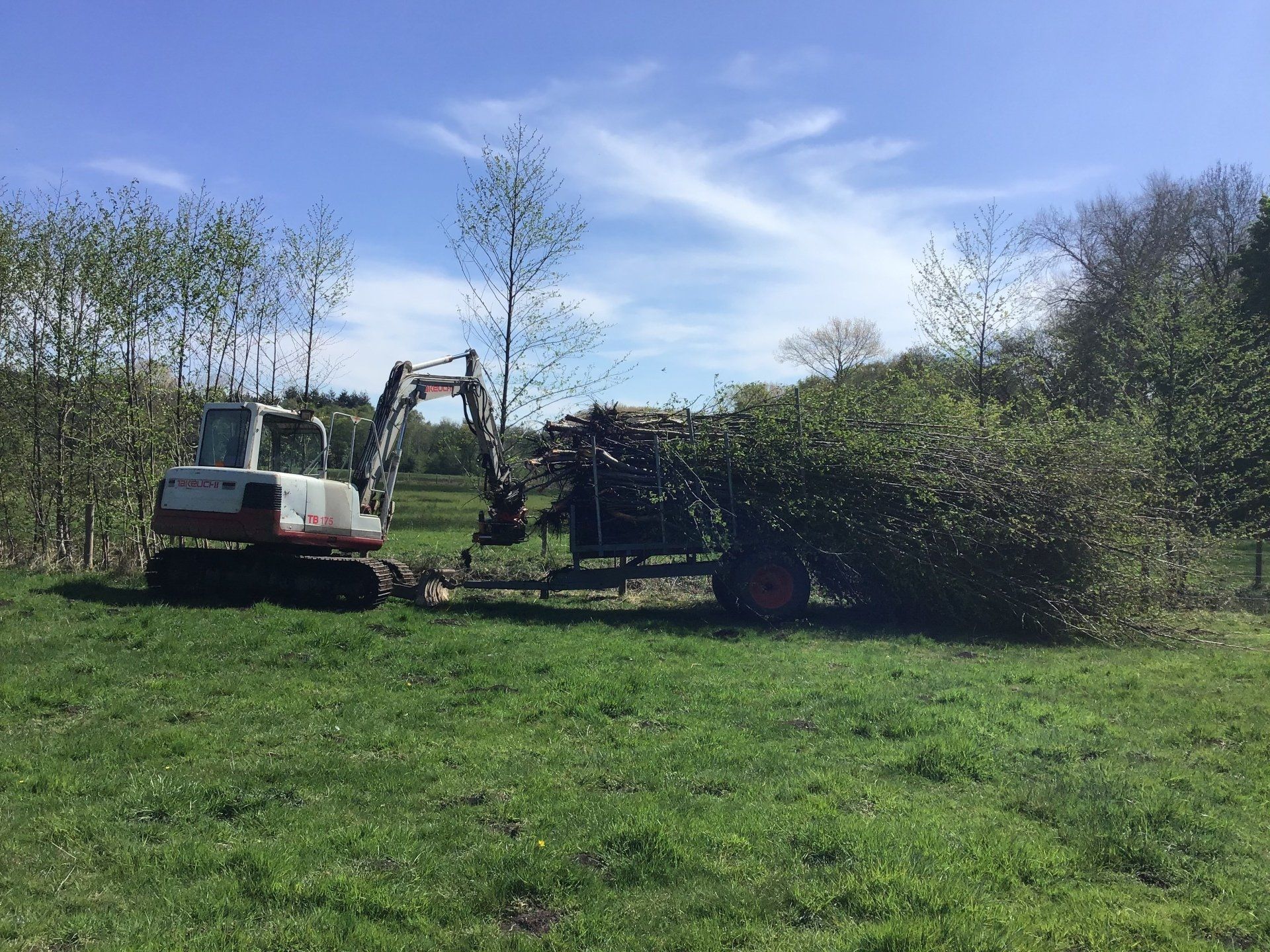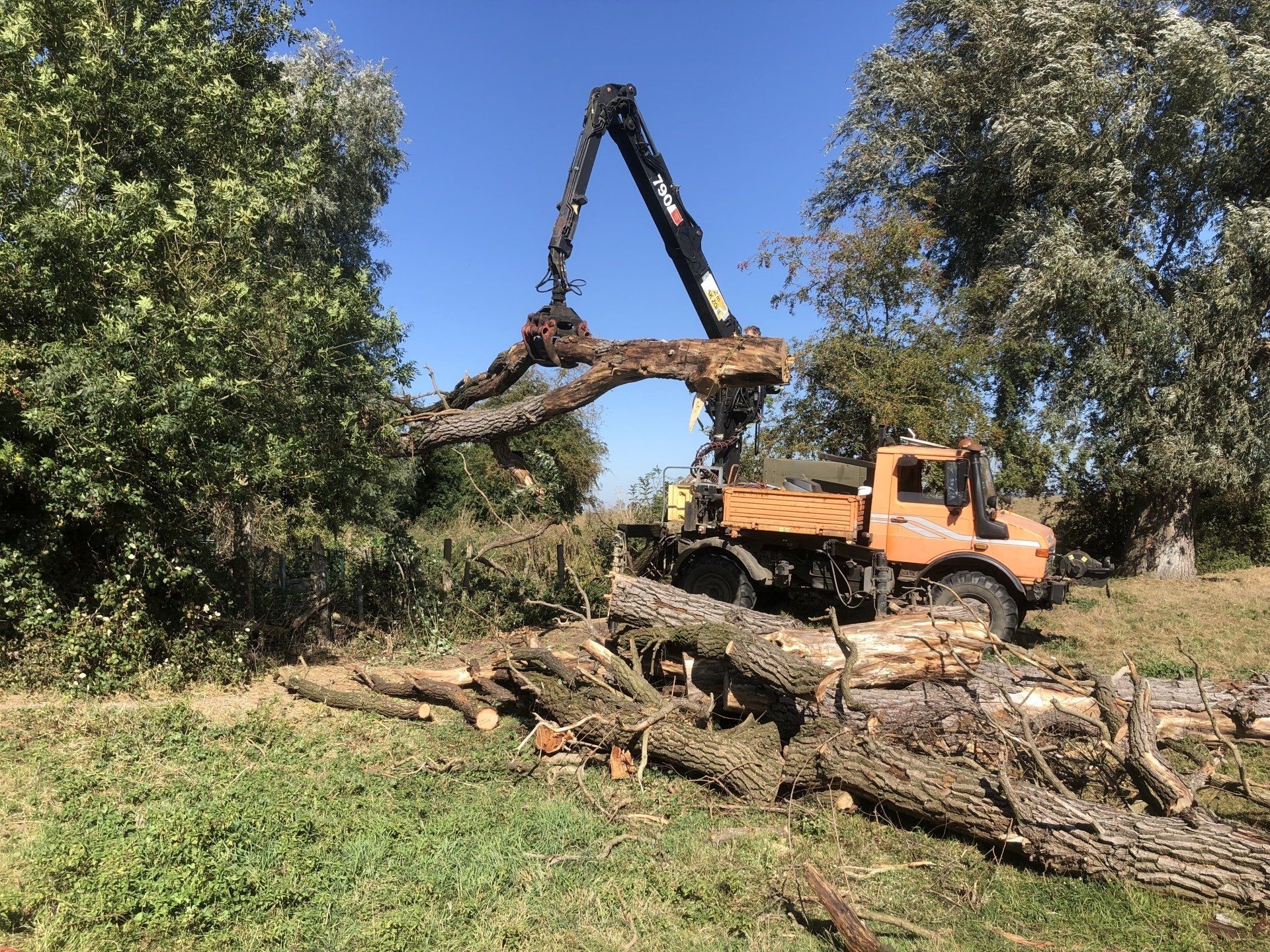 Fallen trees cleared from pumping station outfall using the reach and off road capability of Unimog and mounted timber crane