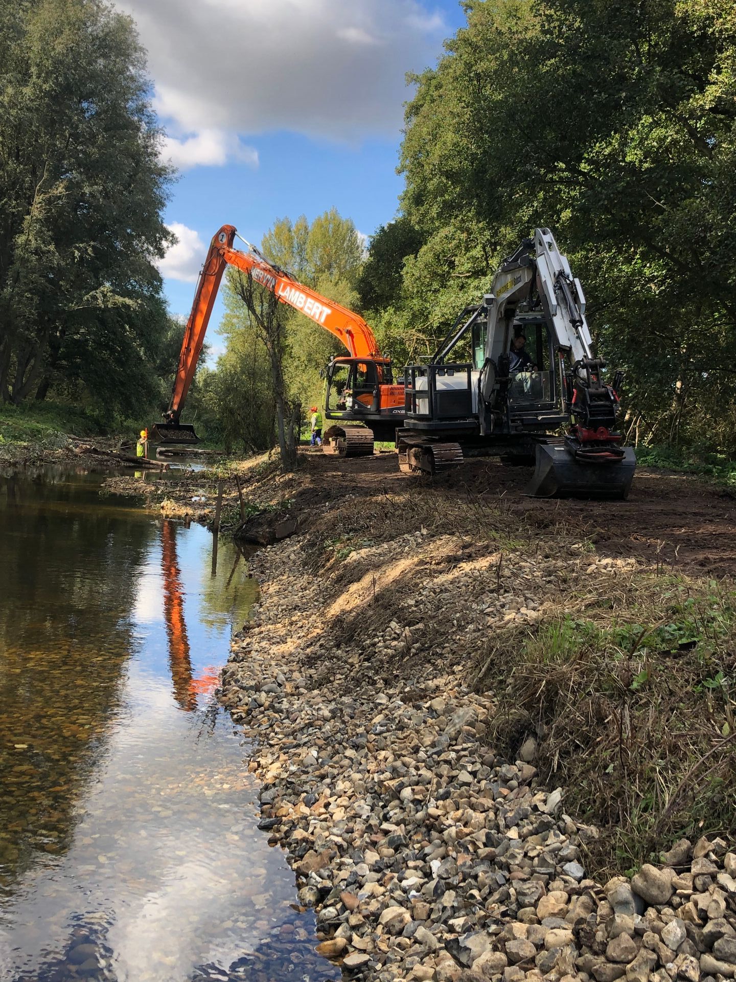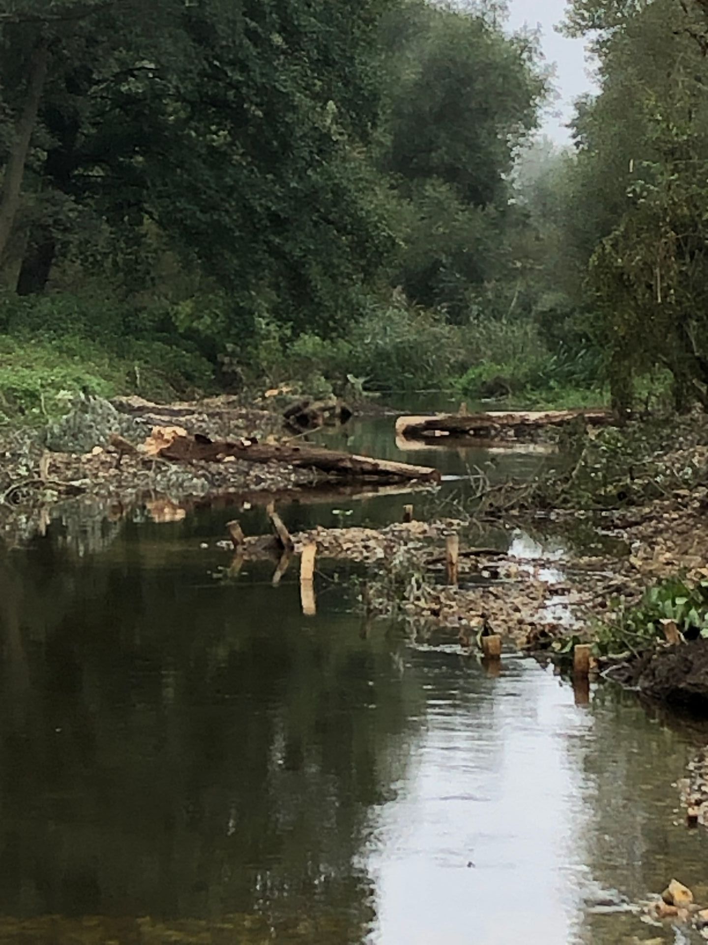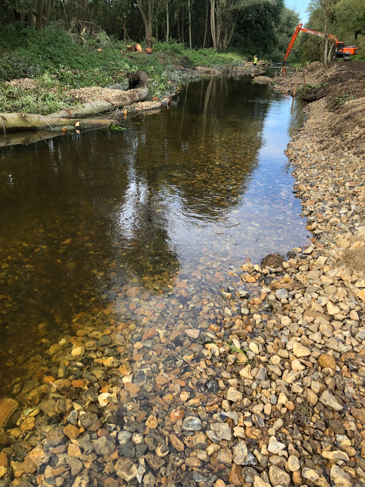 Sweeping bends engineered into straight section of the River Lark, gravel introduced to improve fish spawning grounds and direct flow