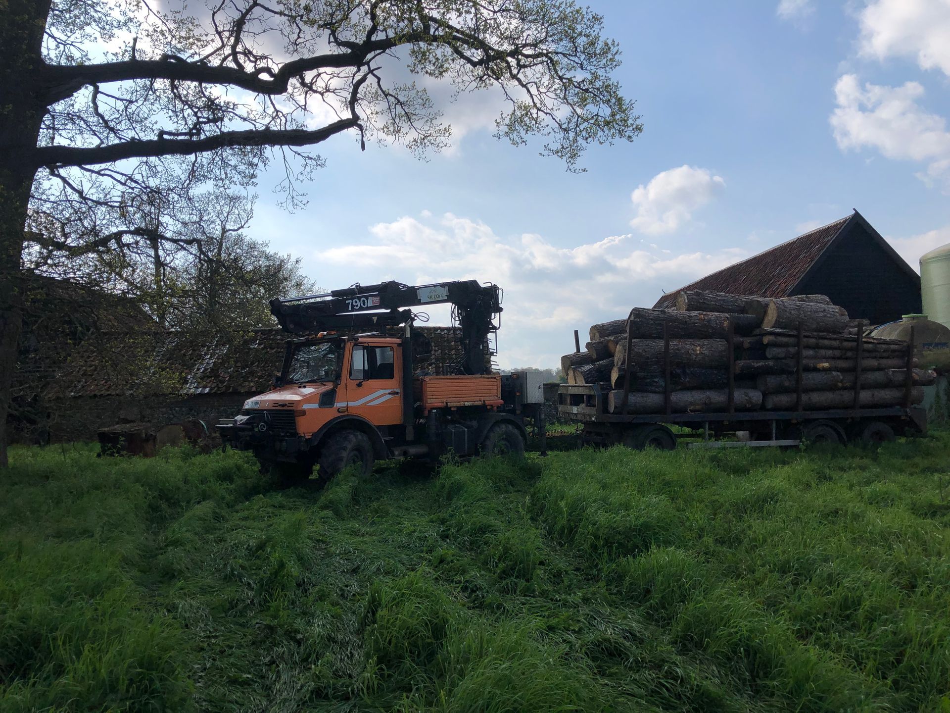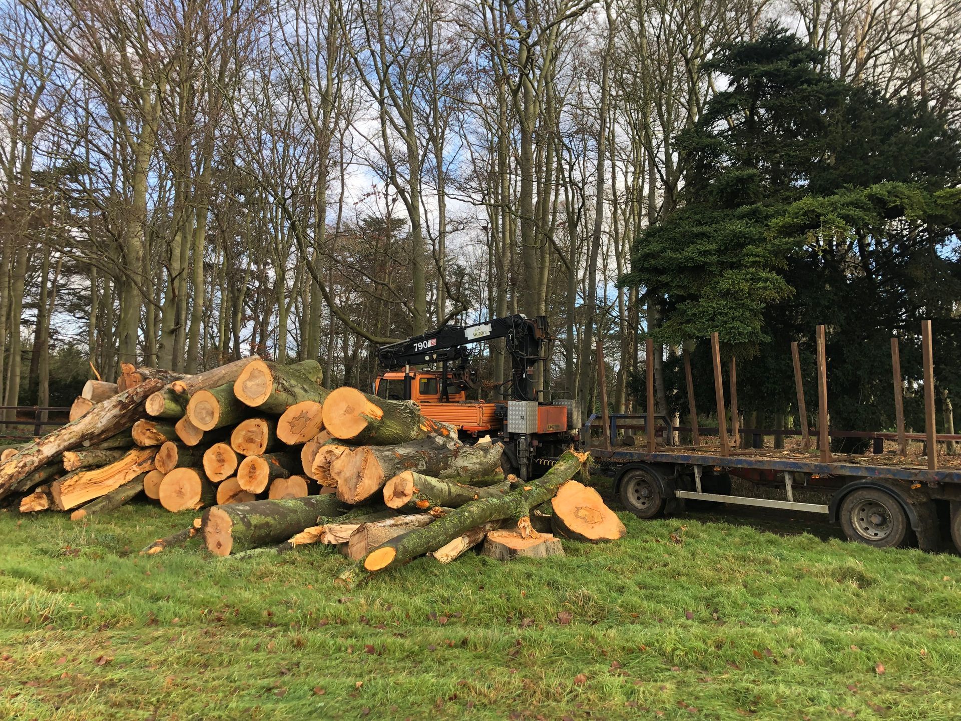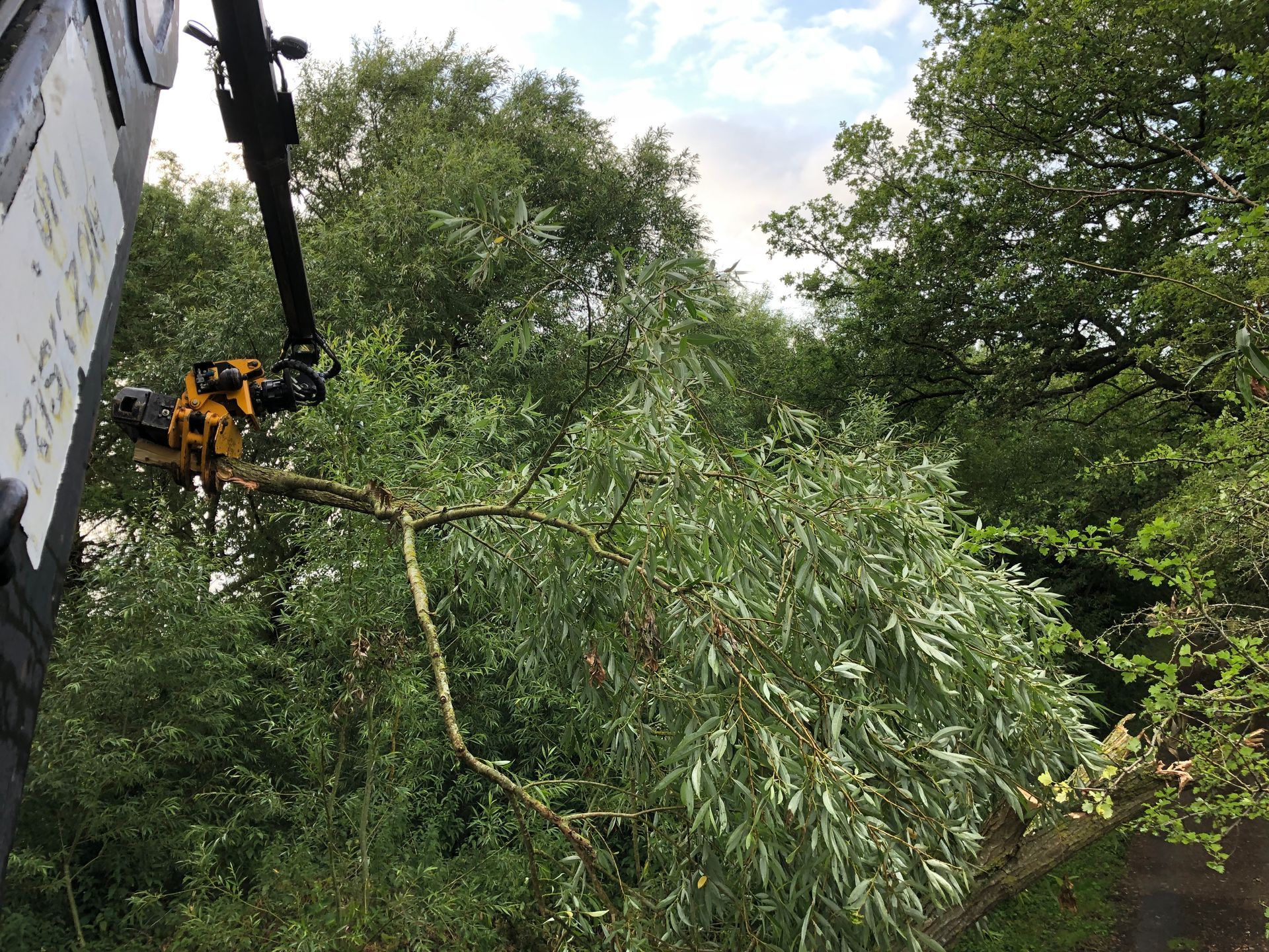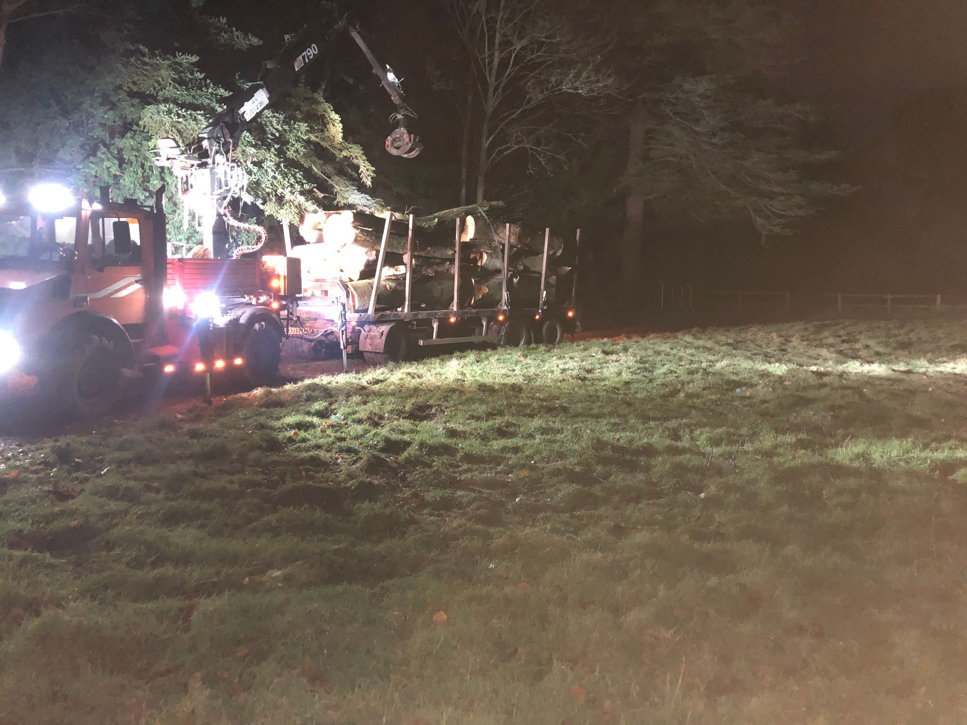 Safe effective removal of windblown trees with Grapple saw attached to Unimog Hiab